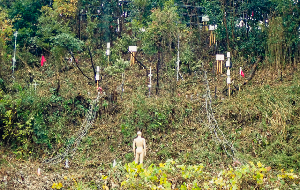 実験現場は、落合技術顧問がNHKと相談の上、所有者の了解を得て、千葉県富津市の、宅造途中で放置された切取斜面上部の山腹斜面に設定されました。